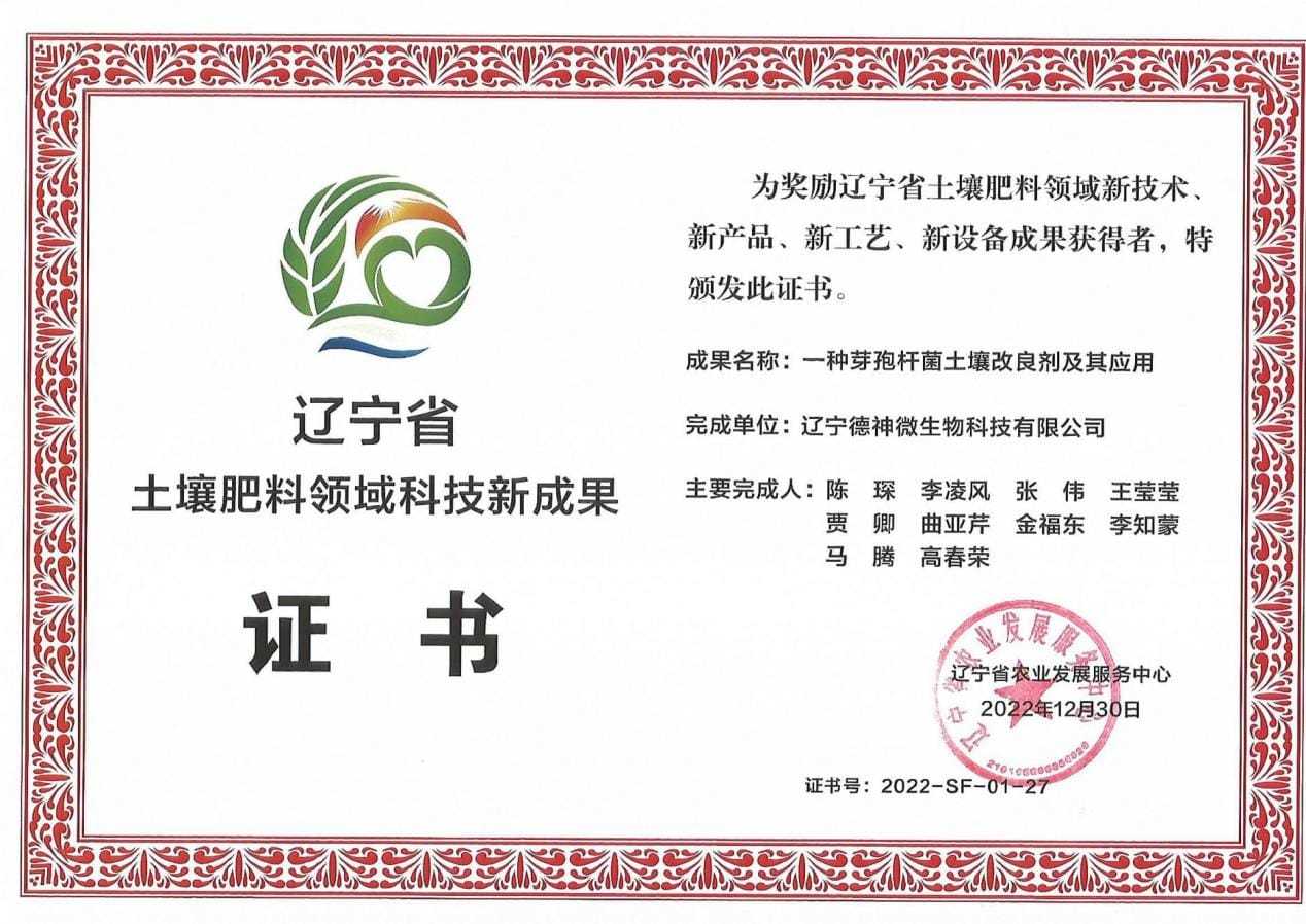 遼寧德神微生物科技有限公司“一種芽孢桿菌土壤改良劑及其應(yīng)用”喜獲土壤肥料領(lǐng)域新成果證書
