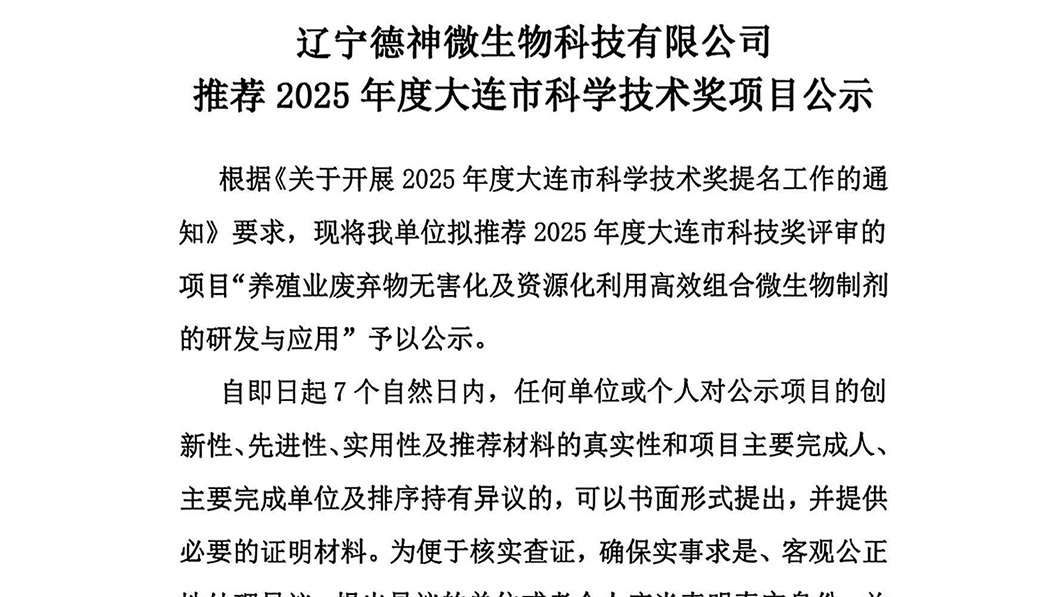 遼寧德神微生物科技有限公司推薦 2025年度大連市科學(xué)技術(shù)獎項目公示